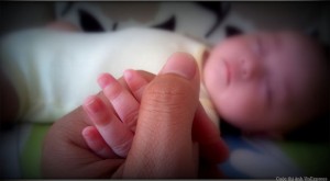 Bàn tay thơ trẻ nằm ngoan trong tay cha, em bé bám trên lưng bố [...]
